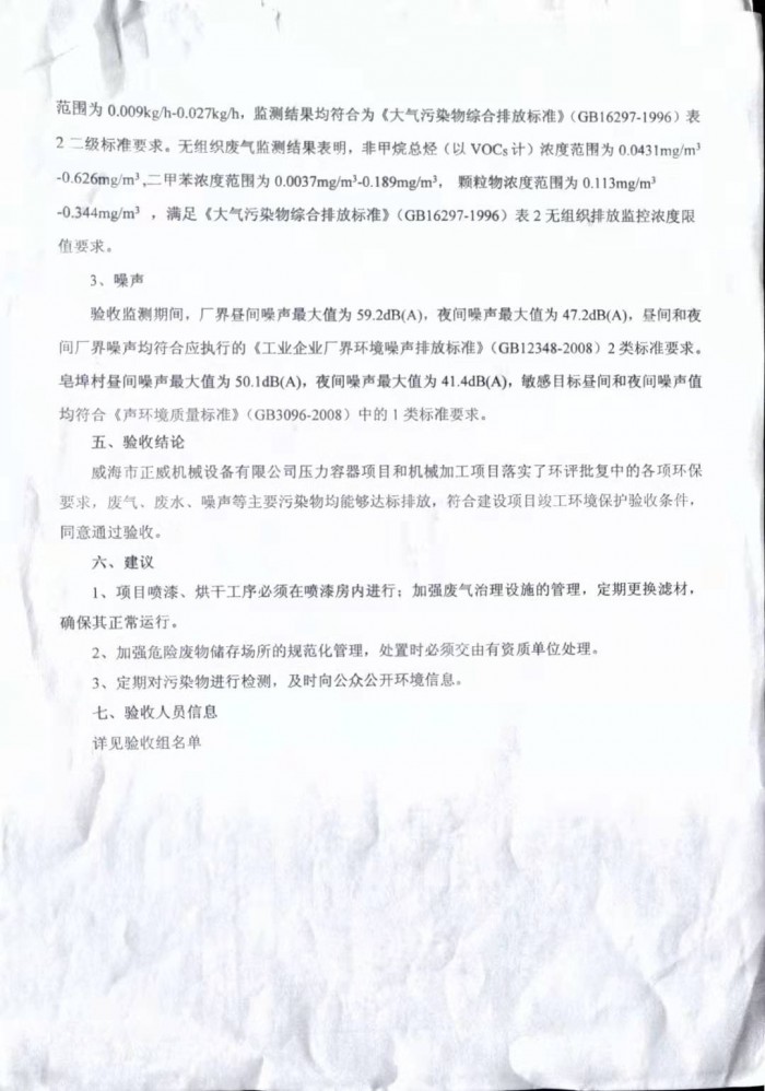威海市正威機械壓力容器項目和機械加工項目竣工環(huán)境保護驗收意見公示
